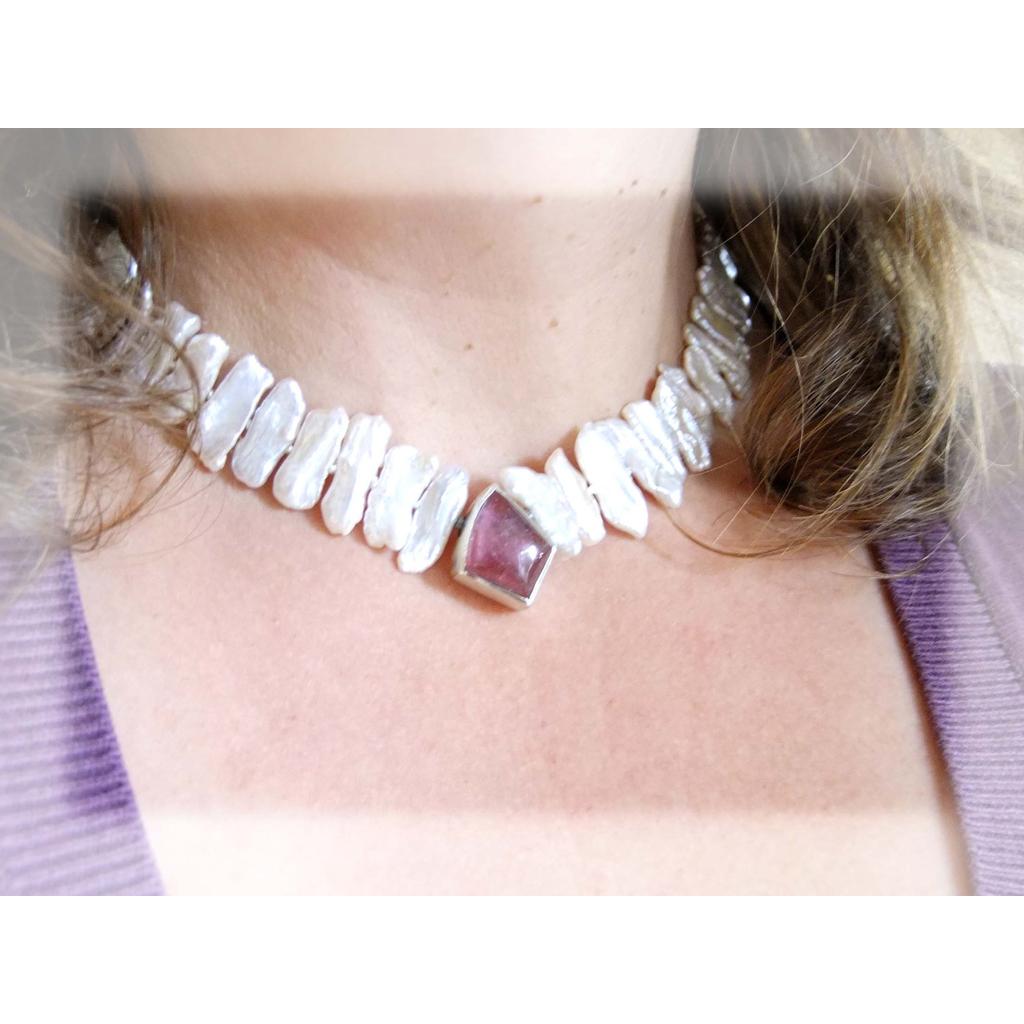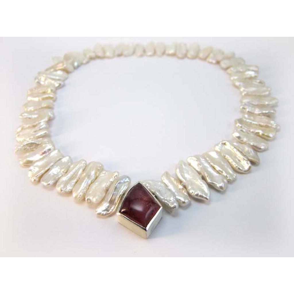 *absolutes Einzelstück* Auffälliges und wirkungsvolles Süßwasserzuchtperlencollier in Stiftform mit viereckigem rosa Turmalin. In der Fassung ist die Wechseschließenmechanik untergebracht. Die Kette ist mit Perlseide durchgeknotet- dadurch schmiegt sich dieses Collier an den Hals der Trägerin....