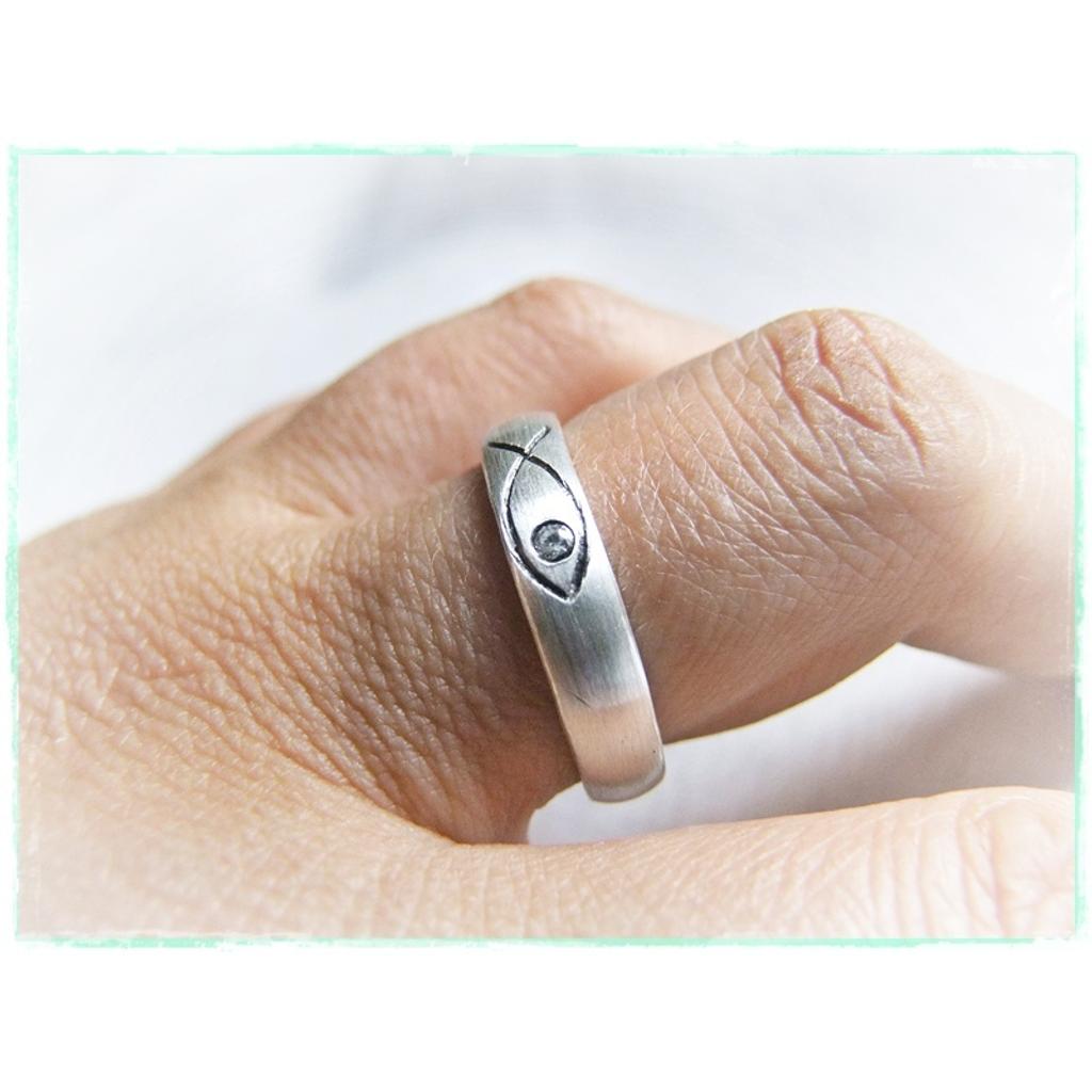 Dieser Ring ist auch als kleiner Ring mit einem Mindestdurchmesser von ca. 17 mm herstellbar.Diese Größe ist, abhängig von der Namenslänge, auch noch gravierbar. Schmaler 925/Sterlingsilberring mit dem Fisch als christlichem Symbol- in seiner Mitte ein eingeriebener goldfarbener oder weißer Zirkonia
